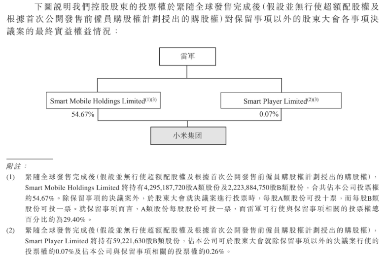 小米集团采取“同股不同权”的股权结构,将公司股本划分为A类股份和B类股份。对于提呈公司股东大会的任何决议案,A类股份持有人每股可投10票,B类股份持有人每股可投1票;但对于保留事项的决议案,AB股每股均享有一票投票权。