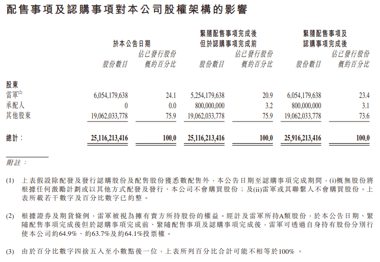 此外,根据小米集团今年三月在港交所发布的公告,截至公告当日,雷军持有小米集团的股份60.54亿股,持股比例为24.1%,并拥有64.9%的投票权。在完成此次配售及认购事项后,其持股比例将降至23.4%,但仍将掌握64.1%的投票权。
